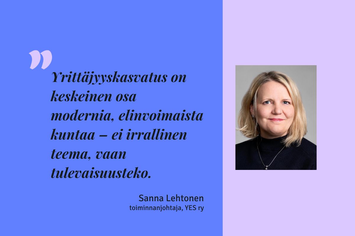 Sanna Lehtonen on Suomen merkittävimmän yrittäjyyskasvatuksen asiantuntijaverkoston, YES-verkoston johtaja. Hänellä on yli 20 vuoden kokemus yrittäjyyskasvatuksen kehittämisestä eri rooleissa. Hän kokee tällä hetkellä tärkeimmäksi tehtäväksi rakentaa yrittäjämäistä toimintakulttuuria oppilaitokseen ja sitä ympäröivään yhteiskuntaan. Työssään YES-verkostossa hän tähtää siihen, että yrittäjämäinen toimintatapa on kiinteä osa suomalaista arkea. Ennen yrittäjyyskasvatuksen innostajan saappaisiin astumista hän toimi luokanopettajana ja rehtorina. Lehtonen on toiminut myös yrittäjänä ja perheyrityksen osakkaana.